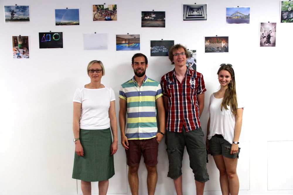 Ausstellungseröffnung und Preisverleihung im Medienraum der Erlanger Südmensa am 3. Juli 2015: FAU-Vizepräsidentin Prof. Dr. Antje Kley (links) mit den Siegern (v.l.) Thomas Kleinert (1. Platz), Nico Moroff (2. Platz) und Leonie Mayer (ist auf dem drittplatzierten Foto zu sehen und vertrat Fotografin Carolin Kirschner, die leider verhindert war).
