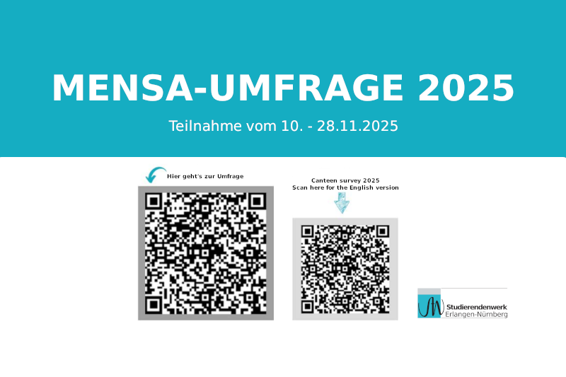 Noch bis 28. November läuft unsere Mensa-Umfrage: Ziel ist es, Eure Zufriedenheit zu sichern und unser Angebot kontinuierlich zu verbessern. Eure Rückmeldungen helfen uns direkt dabei, Speisepläne, Service und Abläufe weiterzuentwickeln. Als Dank für die Teilnahme verlosen wir unter allen studentischen Teilnehmenden insgesamt fünf Mensagutscheine im Wert von je 25 €.
